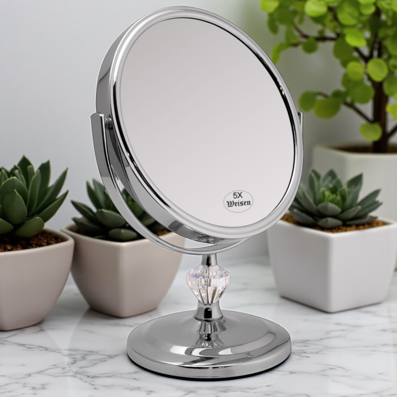 Самые популярные — с увеличением 2x и 3x. Они подходят для обычного ухода и лёгкого макияжа. Зеркала с увеличением 5x и 7x помогают рассмотреть мелкие детали, например, для коррекции бровей. Зеркала с 10x увеличением показывают очень мелкие детали кожи — отлично для профессионального макияжа и ухода, а также для тех, кто носит очки с сильными диоптриями. Есть и большие увеличения — 15x, 20x и выше, но для дома обычно хватает 10x.