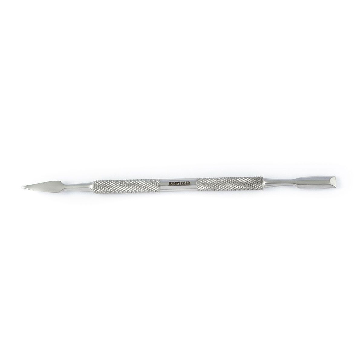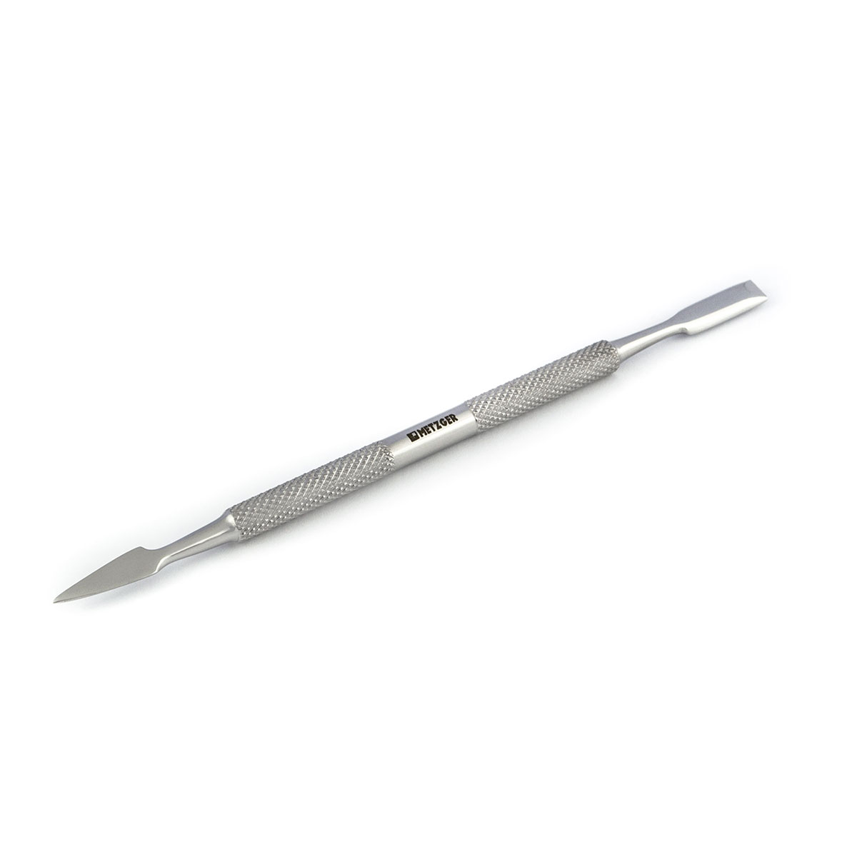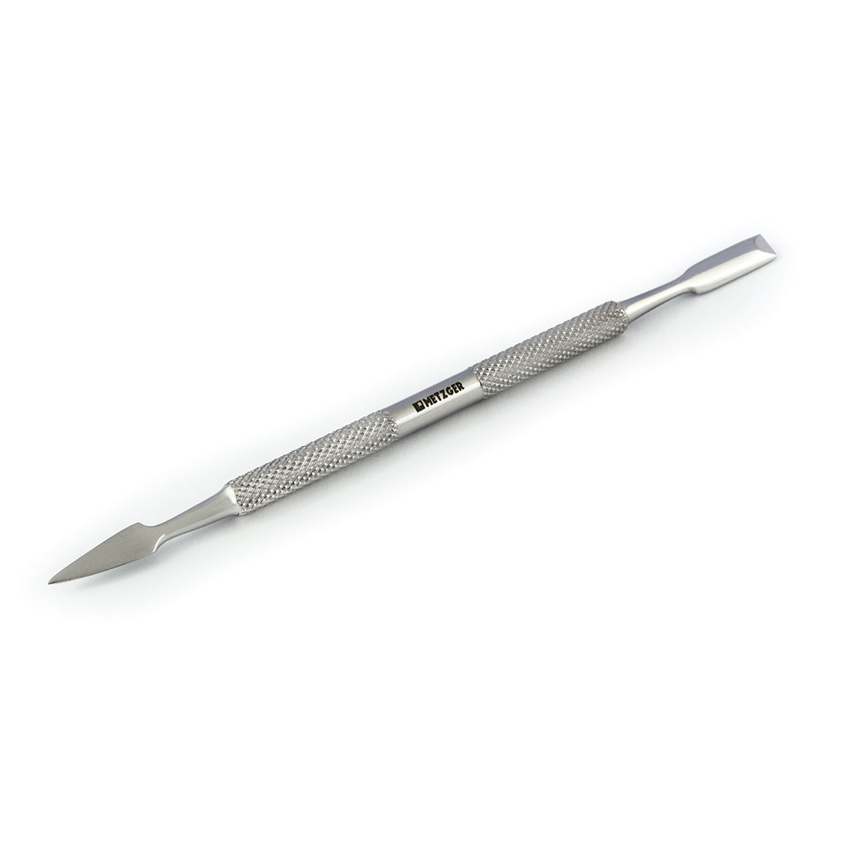 Шабер двухсторонний. Имеет две рабочие поверхности - прямоугольную лопатку для отодвигания чувствительной кутикулы и пику, обеспечивающую тщательную очистку ногтевого плато под любым углом.