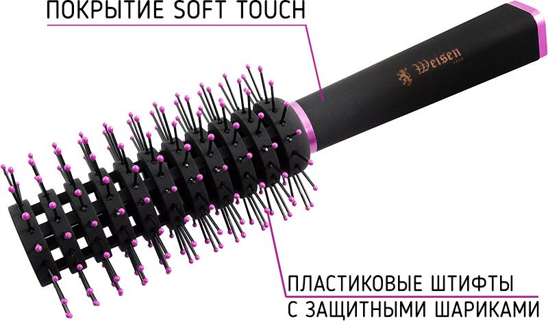 Расчёска круглая вентиляционная Weisen. Предназначена для укладки волос и создания локонов с применением фена или без него. Прорезиненную не скользящую ручку soft touch (нежное прикосновение) удобно держать в руках. Изготовлена из синтетических материалов. На кончиках зубчиков защитные шарики, мягко массирующие и предохраняющие кожу головы от повреждения. Цвет - черный с яркой цветной отделкой. Лёгкая, удобная в работе.