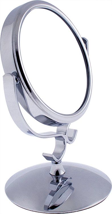 Небольшое двустороннее настольное зеркало в металлическом корпусе на фигурной подставке. Одна сторона с 3-кратным увеличением.