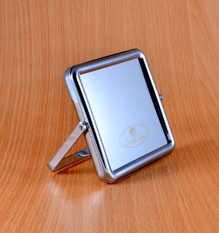 Небольшое двустороннее настольное зеркало в металлическом корпусе на подставке. Одна сторона с 5-кратным увеличением.