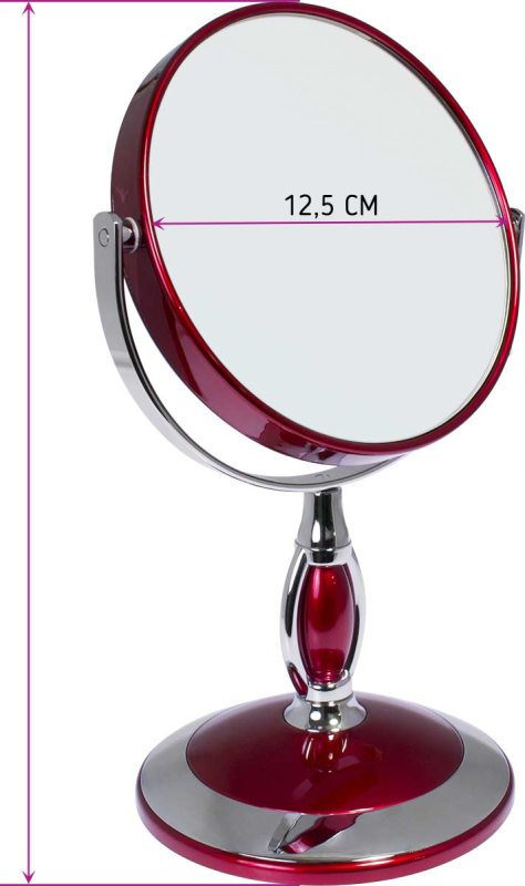 Зеркало косметическое, настольное, двустороннее. Изготовлено из хромированного металла и пластмассы покрытой цветным лаком. Тончайшее высококачественное стекло, используемое при изготовлении (1,5 мм), не даёт искривлений зеркальной поверхности. Увеличение в 3 раза. Приятный, красивый подарок для любой женщины.
