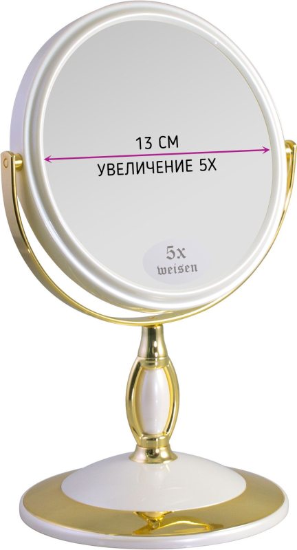 Зеркало косметическое, настольное, двустороннее. Изготовлено из хромированного металла и пластмассы покрытой цветным лаком. Тончайшее высококачественное стекло, используемое при изготовлении (1,5 мм), не даёт искривлений зеркальной поверхности. Увеличение в 5 раз. Приятный, красивый подарок для любой женщины.