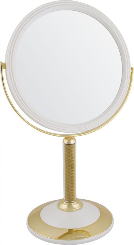 Зеркало косметическое Weisen B7"801TTC PER/G, настольное - роскошное двустороннее настольное зеркало для макияжа. Зеркало выполнено из хромированного металла и лакированного пластика в жемчужно-золотистых тонах. Зеркало на высокой ножке незаменимо во время проведения косметических процедур и нанесения макияжа.