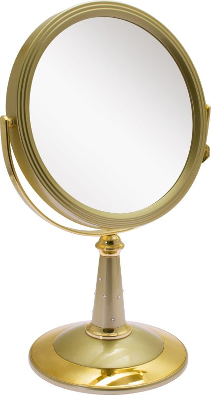 Зеркало косметическое, настольное, двустороннее. Изготовлено из хромированного металла и пластмассы покрытой цветным лаком. Тончайшее качественное стекло, используемое при изготовлении (1,5 мм), не даёт искривлений зеркальной поверхности. Обратная сторона - увеличение в 5 раз. Красивый и нужный подарок для любой женщины.